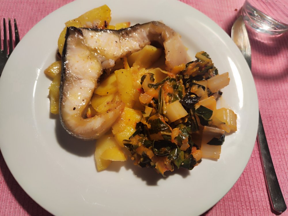 Störkotelett auf Kartoffeln geschmort mit Mangold-Tomatengemüse und grünem Salat. GG wünscht sich für nächsten Freitag wieder Seefisch.