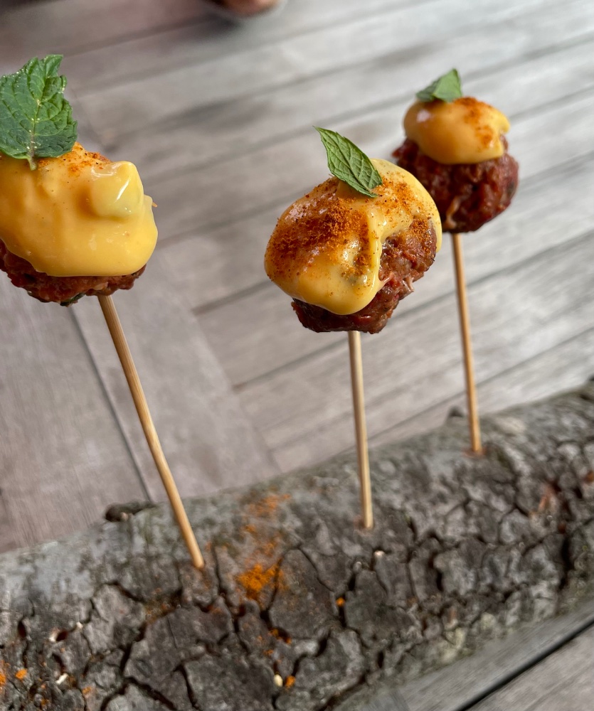 Heutiges Resteessen: Rotbarschtartar/ceviche mit Avokado und Köfte mit Chillicheesesauce und Tomatenragout mit Zimt