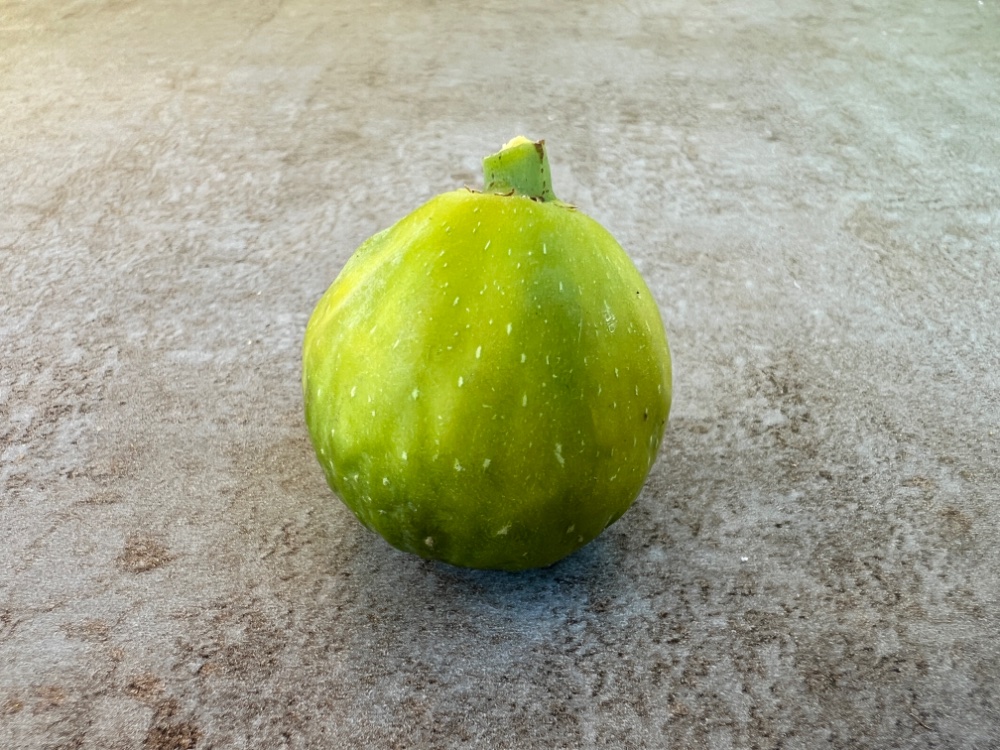 Gegessen haben wir die reife Feige unten im Bild, sowie eine weitere, die hier nicht zu sehen ist. Interessant finde ich, dass diese beiden Exemplare urlaubsbedingt schon leicht überreif waren sowie durch das heiß-trockene Wetter trotz automatischer Bewässerung leicht dehydriert. Man sagt dieser Feige ja auch nach, dass die Früchte am Baum trocknen können, und danach sieht mir das hier aus.
