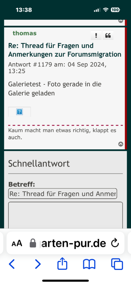 Ich hatte auch ein Bild aus der Galerie eingefügt und es ist verschwunden. Also derzeit besser Bilder nur als Anhang einfügen bis der Wurm gefunden ist.Zausel hat geschrieben: ↑4. Sep 2024, 10:33Was ist da passiert?