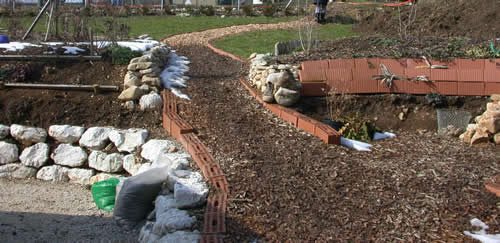 Du kannst ebenfalls kleine Steinblöcke, wie bereits erwähnt, nehmen. Ich hatte sie im 30 km entfernten Steinbruch teilweise selbst geholt. Mit kleineren Steinen aus dem Garten hinterfüllte ich die grossen. So wird man eine Menge Steine los und die grossen haben eine gute Drainage und die Erde wird weniger ausgewaschen.