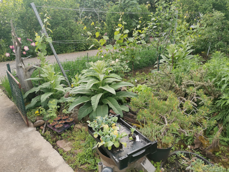 Hier steht V. blattaria seit ca. 10 Jahren und taucht überall im Garten auf. Damals hatte ich nach der ersten Blüte die schönen Samenstände fotografiert. Ein Oktoberfoto.