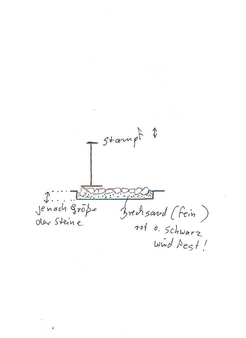Geduld hab ich schon, wenn der Kram dafuer nur hinterher glatt und fest liegt. Hier sieht man noch manchmal Hoefe so befestigt. Brennessel hat allerdings nen Punkt, bei uns ist das Hauptunkraut auslaeuferbildendes Gras, das zwischen Steinen viel Arbeit macht.Ich stell mir auch noch vor, die Steine nach Groesse zu sortieren, denn der Weg fuehrt abwaerts und endet an/in unserem schon vorhandenen offenen und kieselgefuellten Drainagegraben. Soll wirken als ob ein Fluss das sortiert hat...Hmmm und was ist Brechsand? Sowas wie feiner Split, also kantige Teile, nicht runde?Leider ist der Boden im Moment so feucht, dass ich kaum selber da gehen mag, geschweige denn mit einer Schubkarre.Anruetteln mit der Machine(freu!)? Oder tuts so eine Plattform mit Gewicht und Armschmalz?Der Boden hier frisst Sand-Steine-alles, sagen die Nachbarn.Du brauchst Geduld und viel Zeit,denn jeder Stein muß einzeln gesetzt werden und die größeren müssen teils richtig eingegraben werden.Dafür sieht es dann richtig toll aus.Für den Untergrund ebenfalls Brechsand verwenden ca.15 cm.,den gibt es in schwarz und rot.Grüße!