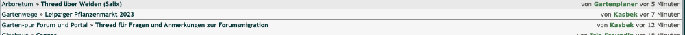 Noch ein Kuriosum: Ändere ich in einem Beitrag den Threadtitel, wird im Beitrag auch tatsächlich der geänderte Threadtitel angezeigt – im Infozentrum steht der Beitrag aber mit dem alten Threadtitel. Hatte das grade unter Gartenwege / Leipziger Pflanzenmarkt 2023: Im Beitrag habe ich den Titel manuell auf 2024 geändert (das hatte ich auch beim vorherigen schon getan, der neue Beitrag enthält aber zunächst wieder den alten Threadtitel, so wie das im alten Forum auch schon war – dauerhaft geändert werden konnte der Threadtitel dort nur, wenn der Threadersteller das beim ersten Beitrag tat), und dort steht er auch als 2024, im Infozentrum aber als 2023.
