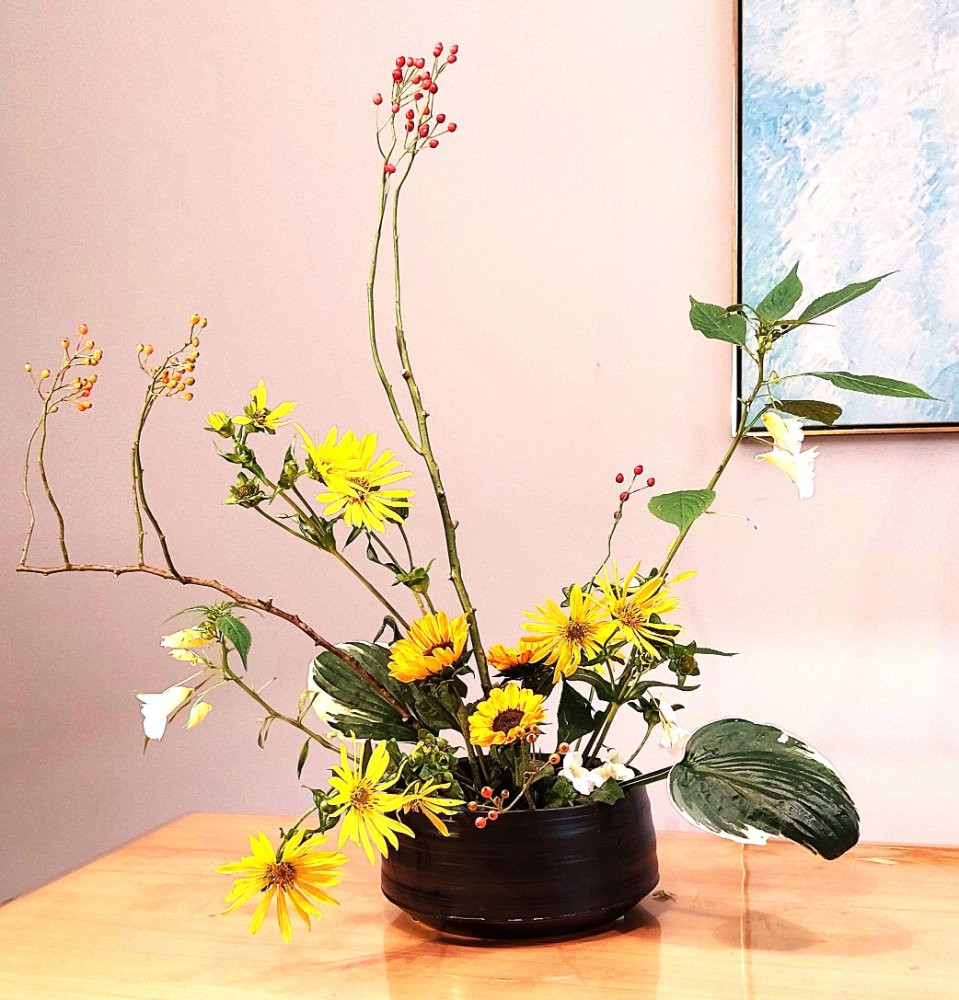 Hier noch einmal mit den gleichen Sonnenblumen wie vorhin. Auch zwei Hagebuttenzweige finden sich hier.