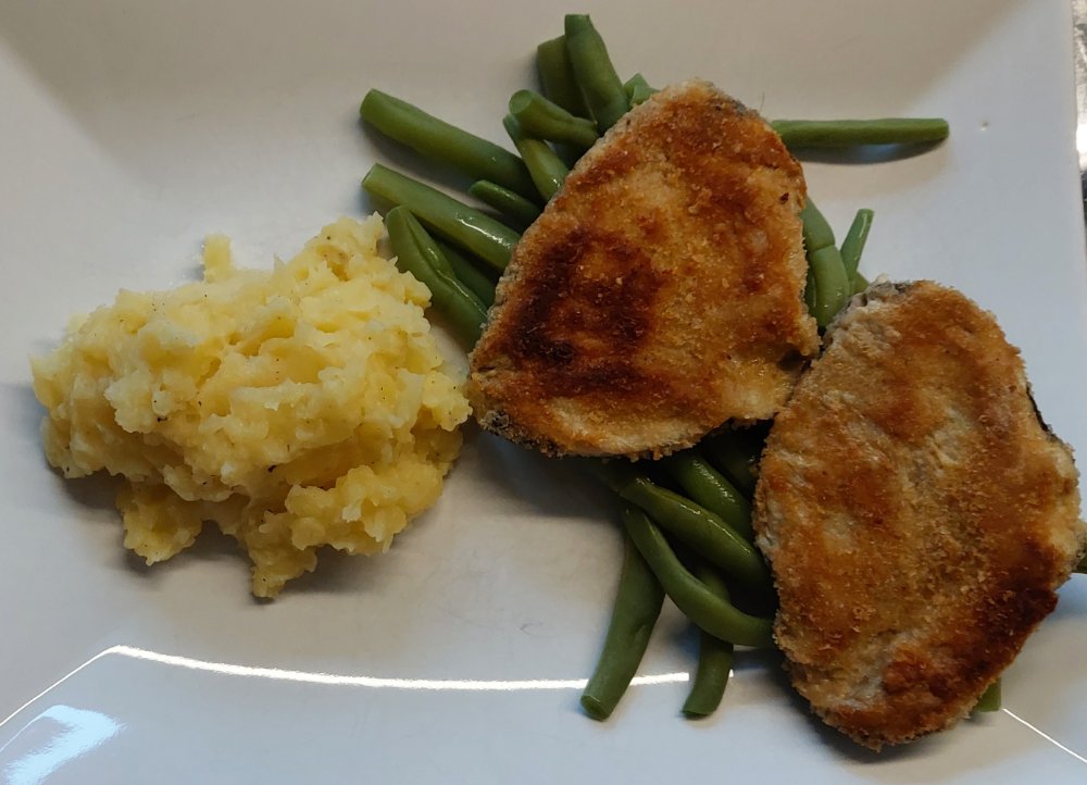 Heute gab's Kartoffelstampf, grüne Bohnen und parierte Parasolschnitzelchen