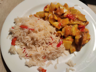 Der Garten liefert viel Gemüse, z.B. die gelben friaulischen Runzelkürbisse, die unreif ganz nussig schmecken. Heute gab es also gemischtes Gemüse: Zwiebeln, gelbe Runzelkürbisse, Auberginen, Tomaten, gewürzt mit Knoblauch, frischem Ingwer, Chili und getoppt mit gehackten Cashewnüssen. Dazu Reis mit