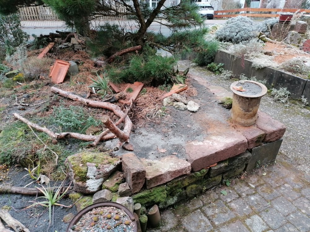 Zudem habe ich das Mäuerchen um etwa 15 cm, = eine Lage Sandstein, erhöht, so dass sich der abgesägte Buchs nun unter Substrat befindet.
