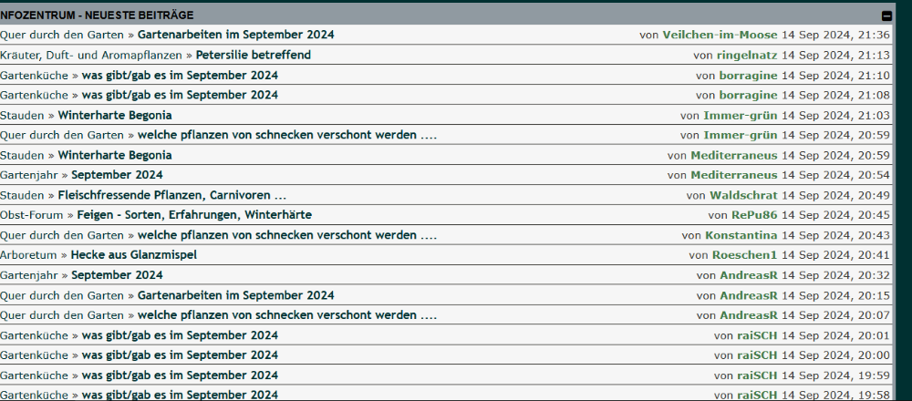 Danke euch für die liebe Begrüßung, Nina, borragine, Apfelbäuerin und GartenladyGartenlady hat geschrieben: ↑13. Sep 2024, 18:32Willkommen zurück, ich habe den Eindruck, dass Du spät dran bist, oder irre ich mich da?