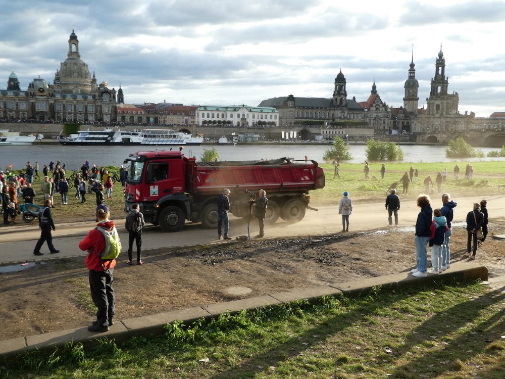 Wir haben gestern Nachmittag genau das getan, was halb Dresden gemacht hat: Wir haben die Regenpause genutzt und sind mit den Rädern an die Elbe gefahren, wo die Abrissarbeiten der eingestürzten Carolabrücke auf Hochtouren laufen.