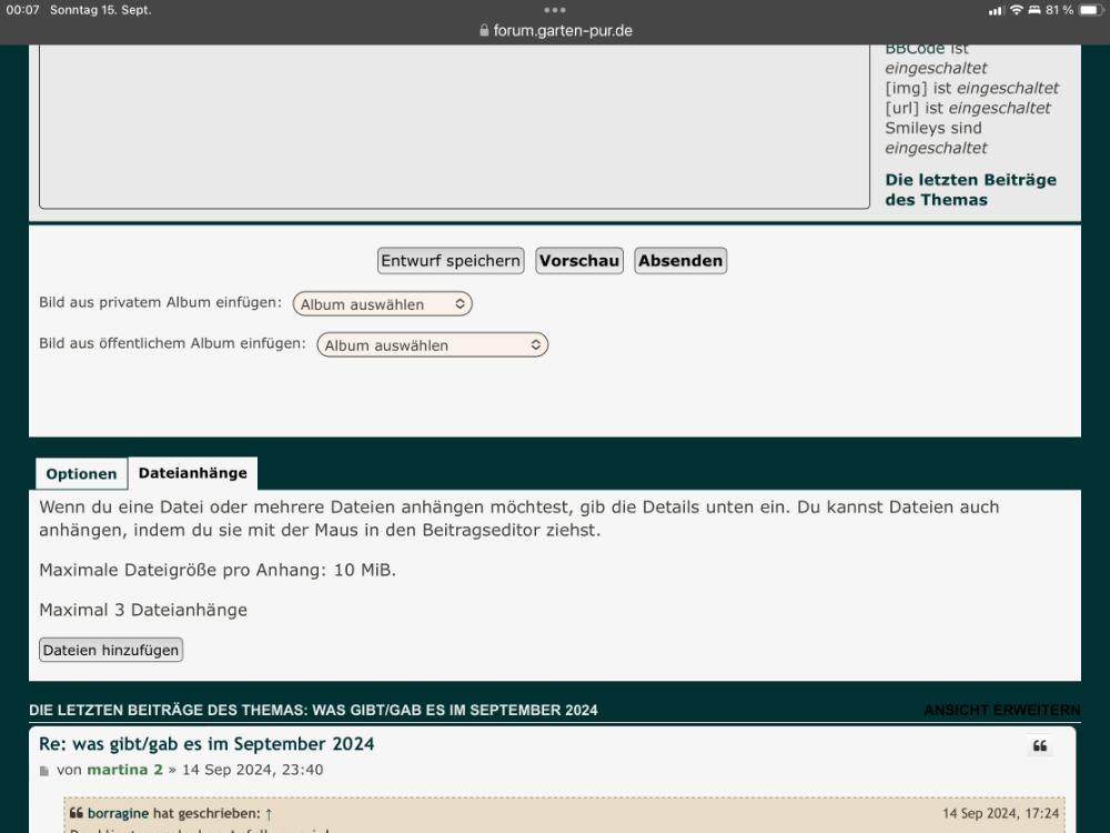 aber es lässt sich mit einem klick auf "vollständiger editor & vorschau" zur normalen texteingabemaske wechseln, wo sich dann wieder über die option ganz unten die fotos anhängen lassen. problem an der schnellantwort: die manchmal mehreren seiten mit neuen antworten geraten darunter gerne aus dem blick und man antwortet auf die vermeintlich letzte antwort und ist dann oft komplett ot.