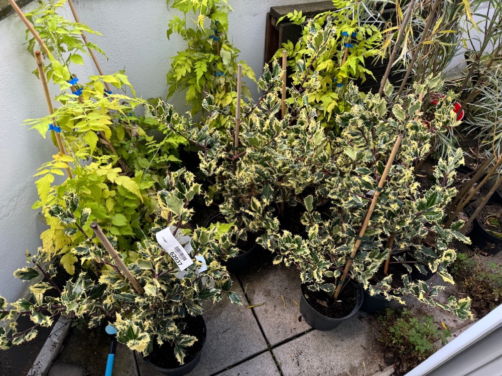 Heute kamen sie mit DPD an, die Töpfe waren nicht wie bei Eggert nochmal einzeln in Plastiktüten gesteckt, die oben zugebunden waren, insofern war ein bisschen Erde auf Wanderschaft gegangen, aber insgesamt sieht alles gut aus, keine Schäden an den Ilex, und definitiv die versprochene Größe: