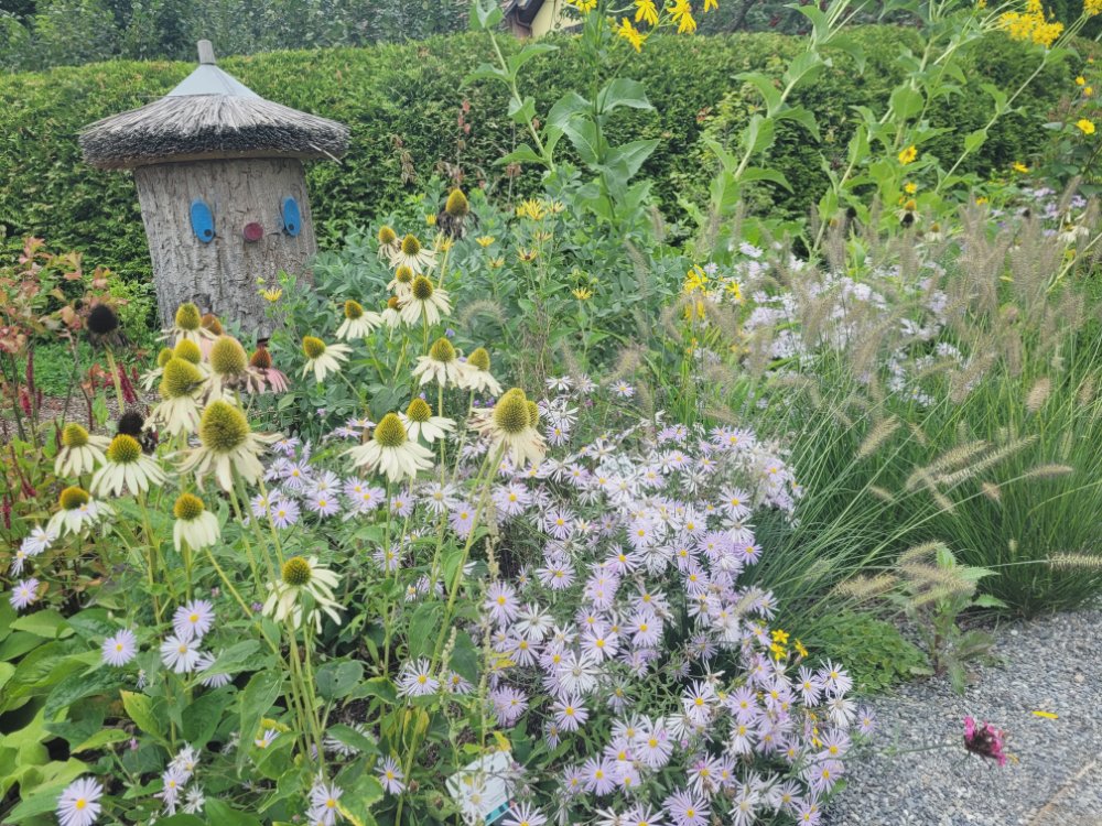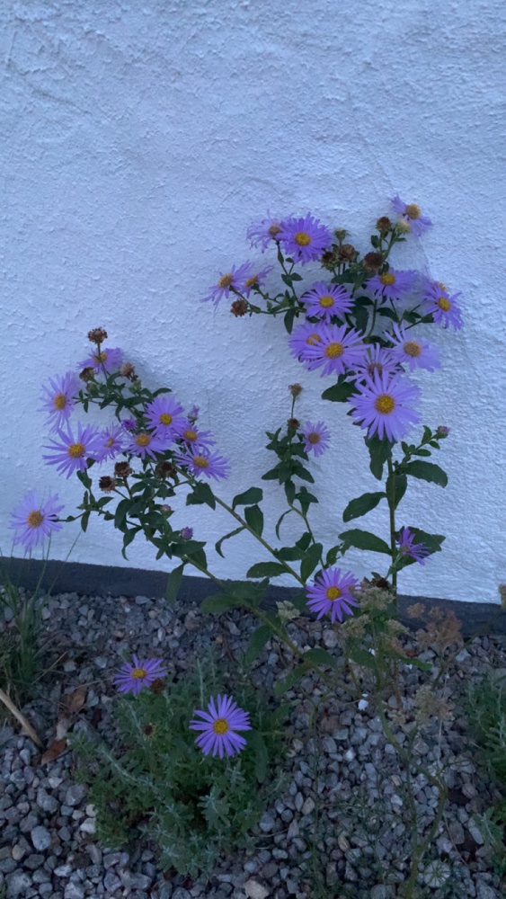 Hier blühen schon einige Herbstastern. Besonders freue ich mich über Aster novae-angliae Semptemberrubin. Die war im ersten Standjahr 2023 nämlich eine pilzverdorrte Vollkatastrophe. Dieses Jahr sieht sie viel besser aus. Das Laub ist gesund und es gibt noch viele Blüten.