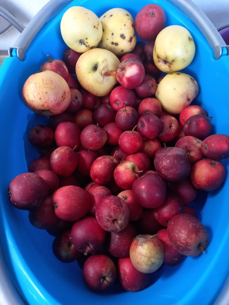 Gestern ein paar Falläpfel gesammelt. Wird noch mehr kommen. Es ist wahrscheinlich ein Purpurroter Cousinot. Daraus wird ein Wein gemacht.