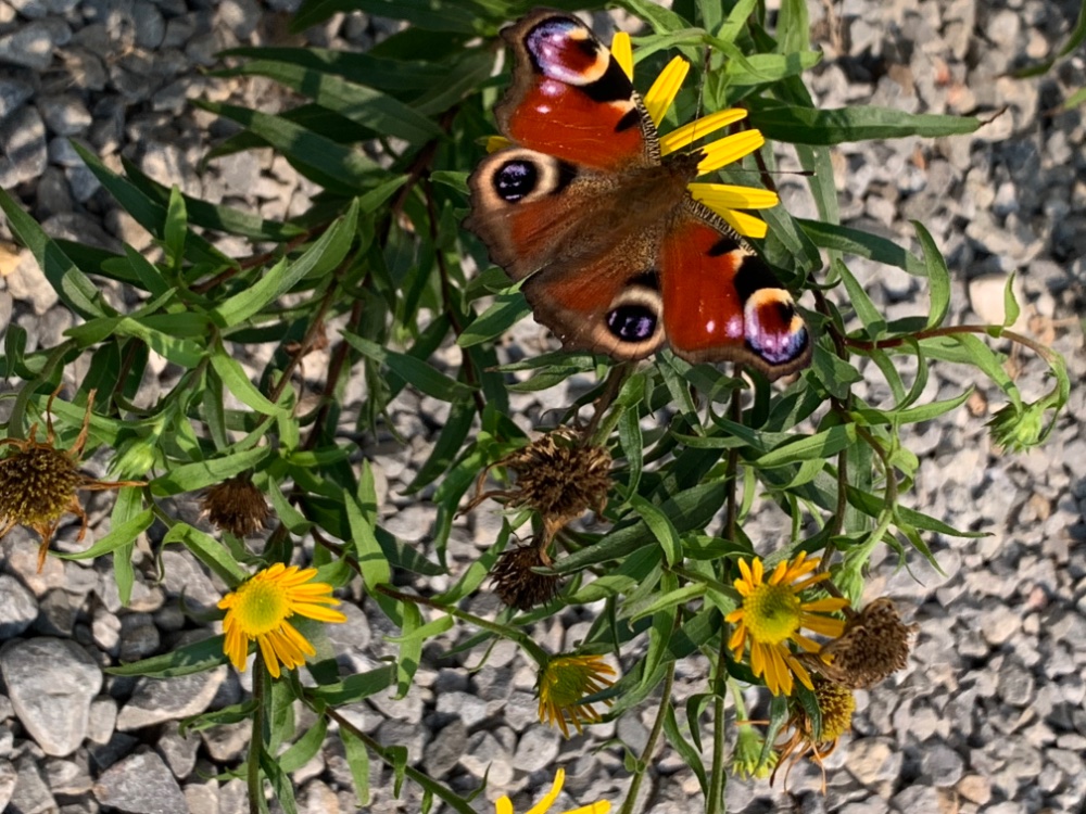 Hauptsächlich werde ich gerade von geschätzt 30 bis 40 Tagpfauenaugen umflattert. Bevorzugt wird eindeutig Verbena bonariensis als Nahrungsquelle. Aber auch Sedum sind gut besucht.