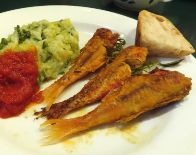 Eigentlich sollte es ja heute Wolfsbarschfilets geben (Der Kroate filetiert, aber danke, Nina, für den Link!), aber dann wurde grade eine frische Kiste mit Streifenbarben aufgemacht, da überlegte ich nicht lange. Ganz puristisch mit Brot, Kohlerdäpfstampf und etwas Tomate, wie man es
