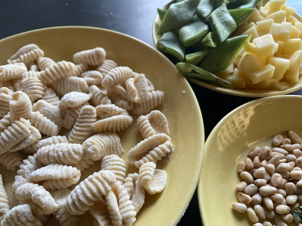 Martina hat mich inspiriert und ich habe Malloredus mit Bohnen, Kartoffeln und Möhrenpesto gemacht.