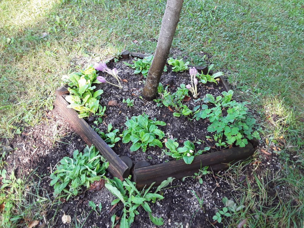 C. autumnale 'Album'. Frisch mit dem Rasenmäher drumrum, ein paar mussten sich opfern.
