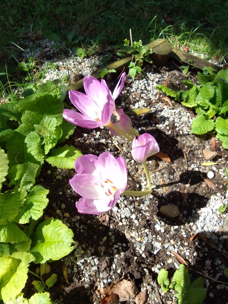C. autumnale 'Album'. Frisch mit dem Rasenmäher drumrum, ein paar mussten sich opfern.