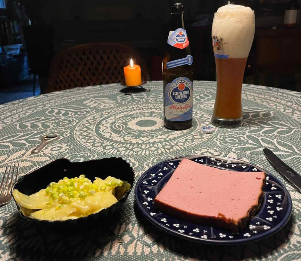 Biergarten-Nachklang im Wohnzimmer: Vorspeise Radi (sehr rass), Hauptgerichte Neuburger, natürlich kalt, und Kartoffelsalat mit Frühlingszwiebeln lauwarm zur Schneider Weißen alkoholfrei.