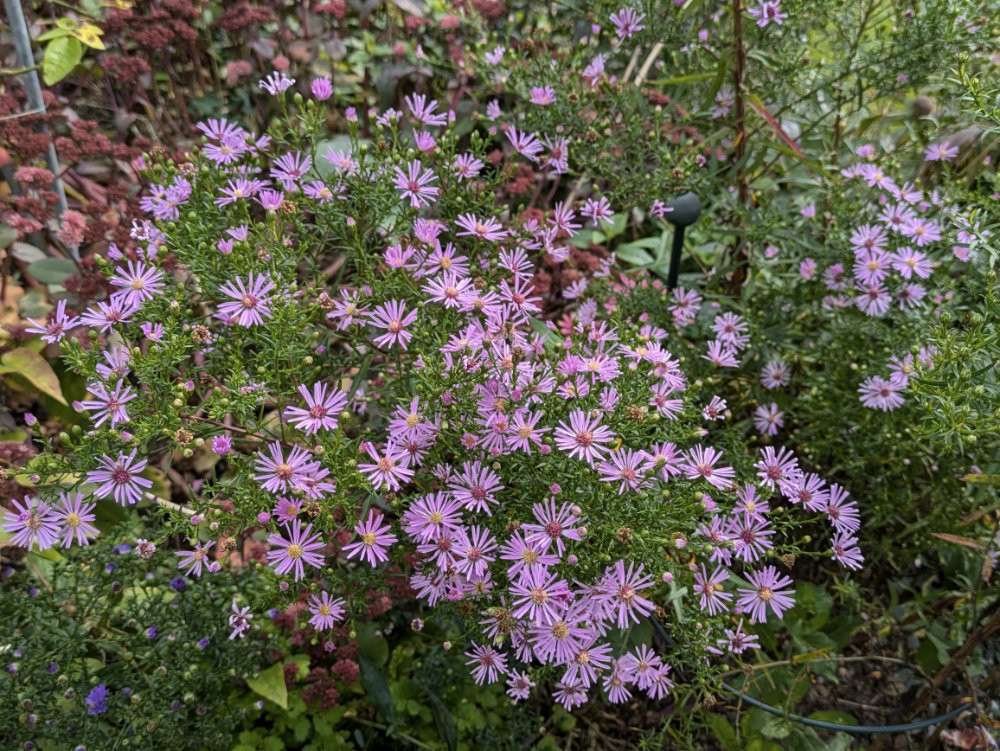 Asternsorten habe ich so gut wie gar nicht (und die wenigen kann ich auch nicht wirklich benennen), aber auch die Sämlinge sind in der Regel sehr hübsch. Manche sind sogar erstaunlich standfest, wie dieser hier, mal schauen, ob ich die vielversprechenden Kandidaten markiere und im Frühling neu auspflanze...