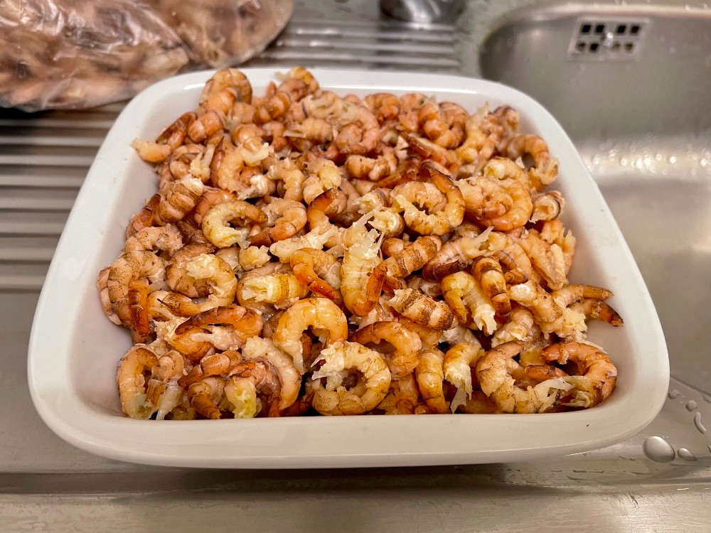 Ich habe letztens Crevetten angebraten, gepult und zur Seite gestellt, die Schalen mit (Garten)Tomaten gekocht und nach dem sieben Soße, Crevetten mit Spaghetti geschwenkt.