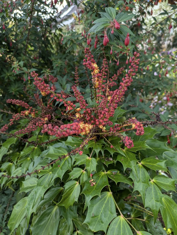 Mahonia 'Cabaret' steht eigentlich zu dicht neben Fuchsia 'David'. Da sich beide aber gut etabliert haben, wage ich nicht dran zu rühren.