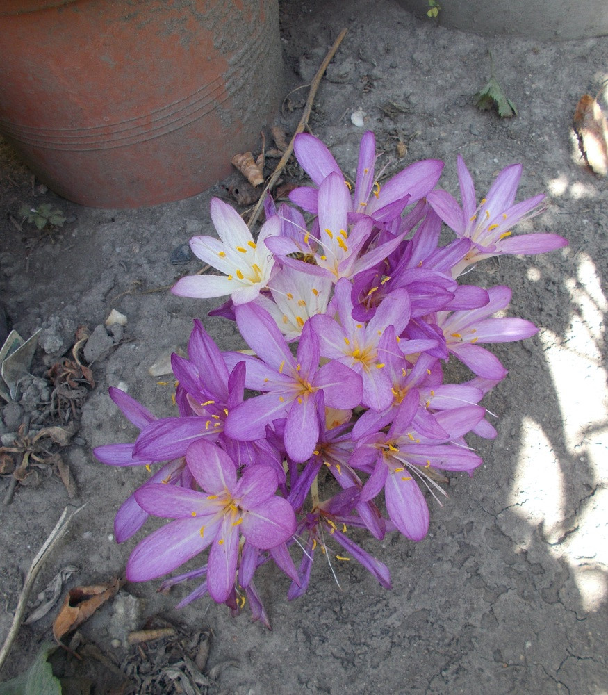 Vor Jahren hatte ich an dieser Stelle mal Zwiebelreste mehrerer Colchicum 'verklappt', die im Topf nicht glücklich wurden. Eine hat überlebt, und jedes Jahr kommen nun mehr Blüten