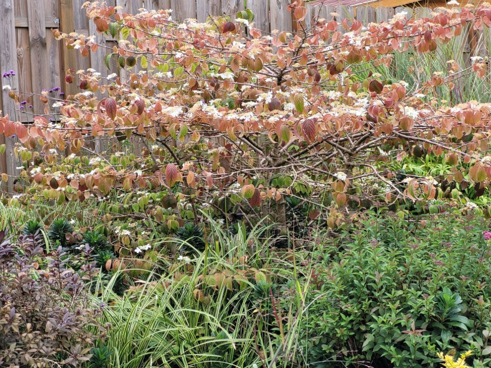 Wieder und immernoch in Blüte ist Viburnum plicatum 'Mariesii' .