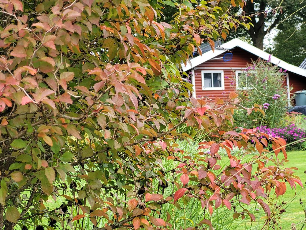 Die kleine Sorbus aucuparia 'Autumn spire' hat schon fast alle Blätter im Sturm verloren... also keine nennenswerte HerbstFärbung in diesem feuchten Jahr.