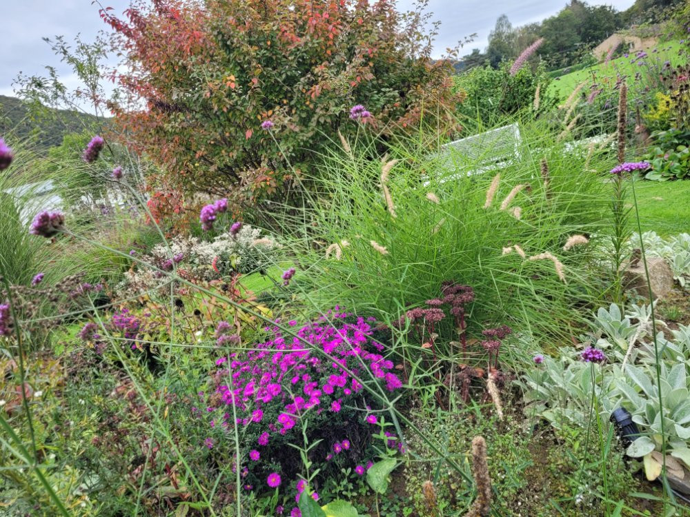So wie es aussieht, hast Du auch die perfekte Balance an lehmigem Boden für eine gute Wasserspeicherkapazität, aber er ist nicht so fett wie meiner, so dass alles übermäßig wächst, nur um dann umzufallen. Die Gehölze haben in den vergangenen Jahren deutlich zugelegt, und selbst an einem eher trüben Tag leuchten die Herbstfarben nun kräftig.