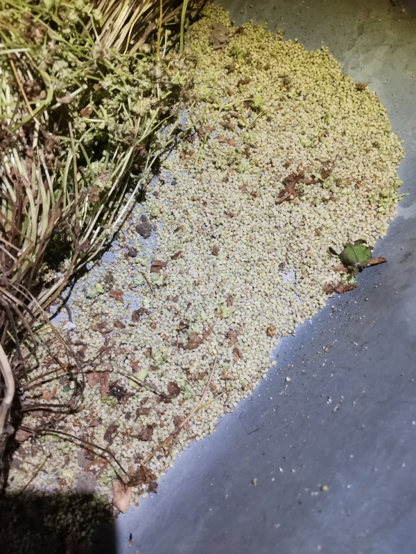 Nach dem ersten Tag im Schubkarren fällt doch schon recht viel ab. Man hört es bei Berührung rieseln. Also evtl erntest du doch schon etwas früher und hängst über Zeitung oder Plane auf. Die noch grünen Samen auf dem Bild dunkeln später nach.
