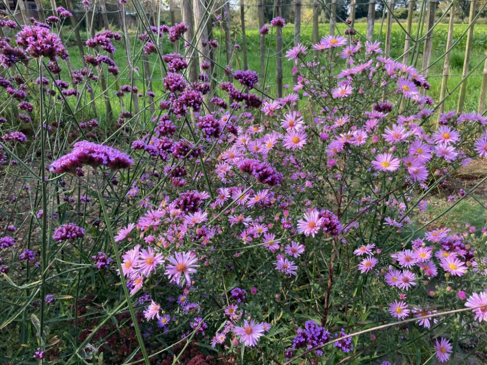 Dieses Jahr wurden viele Stauden von den Schnecken gemeuchelt. Einige Astern haben überlebt und machen sich gerade schön mit den Verbenen, die in den Lücken gut gekommen sind. Nächstes Jahr sieht es sicher wieder anders aus.