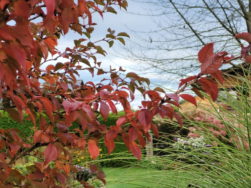 Die Färbung ist auch jedes Jahr unterschiedlich, mal ist das Laub orange wie jetzt, mal feuerrot, dann wieder zeigt es richtig abgestufte "Regenbogenfarben".