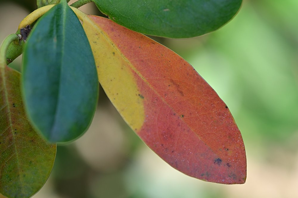 Aber wer sagt, dass Rhodos nicht auch Herbstfärbung haben können, nicht alle, aber dieser größte und schönste im Garten. Uralt, Name natürlich unbekannt.