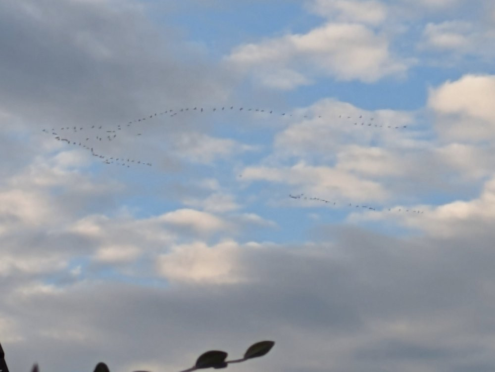Hier heute über unseren Köpfen große Gruppen von Wildgänsen mit lautem Geschnatter, auch in 1- er Formation. Es wird ganz offensichtlich Winter...