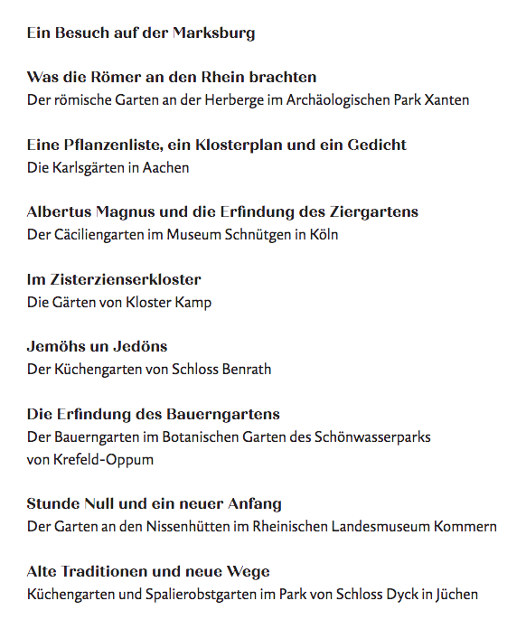 Falls sich jemand hier für historische Küchen- und Klostergärten interessiert, kann ich dieses Buch nur wärmstens empfehlen. Die beiden Autorinnen zeigen in diesem wunderschön bebilderten und hochwertig gedrucktem Bildband eine Auswahl erhaltener und gut gepflegter historischer Küchengärten im Rheinland. In den Texten erfährt man viele spannende und faszinierende Details zu den Gärten und den darin vorkommenden Pflanzen. Im Bild könnt Ihr sehen, welche Gärten dort im Einzelnen vorgestellt werden.