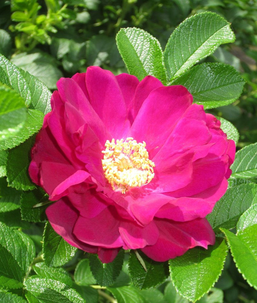 1. Rosa 'Euphrosyne', eine Riesin, die bis zum Frost blüht, wenn man Verblühtes ausschneidet. Anderenfalls bildet sie Büschel