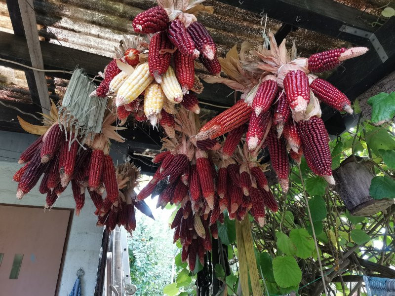 Hier ist nun die Ernte geerntet und unterm Dach zum trocknen aufgehängt.