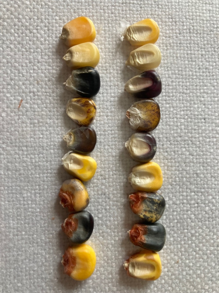 Ich hoff mal man sieht es, ich würde sagen, beim kauen, eher Zahnmais, also die meisten kann ich beißen, es ist keine so, dass ich Angst haben muss, dass die Zähne zuerst nachgeben, wie beim Mountain Corado oder wie der heißt, der bunte perlige harte, für Halsketten.thuja thujon hat geschrieben: ↑27. Sep 2024, 11:18 Deine Kolben sehen ganz gut aus. Ist mehr Zahnmais oder Hartmaisgenetik zu sehen? Wie sehen die Körner einzeln aus und kannst du mal einen Querschnitt durch die Körner machen? So dass der Embryo einmal längs und einmal quer und daneben der Stärkekörper durchgeschnitten zu sehen ist.