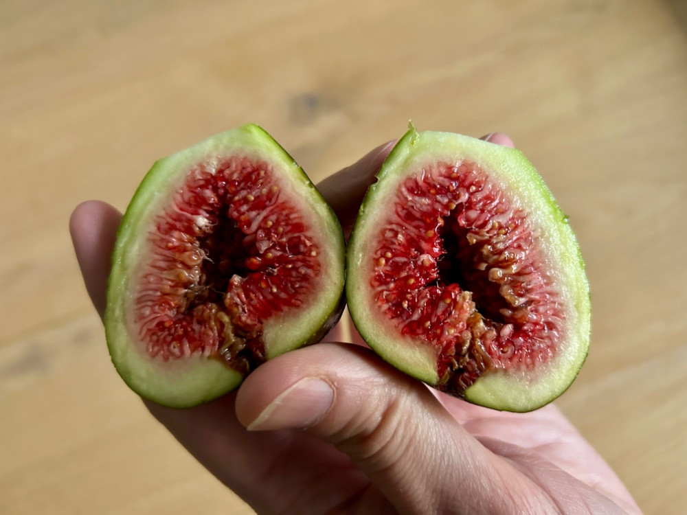 Hier noch die aufgeschnittene Frucht, von der Angeblichen Desert King, die keine ist. Trotz Kälte und so gut wie keinem Sonnenschein, ist die Frucht süß, saftig und hat ein beeriges Aroma. Für mich stellt sich dann immer die Frage, brauchen Feigen zum Ausreifen die Sonne, oder reicht auch ein schattiges Plätzchen. Ich hab bei mir 3 Pflanzen unter zwei Hochstämmen gepflanzt. Die Feigen bekommen kaum Sonne und ich werde das beobachten.