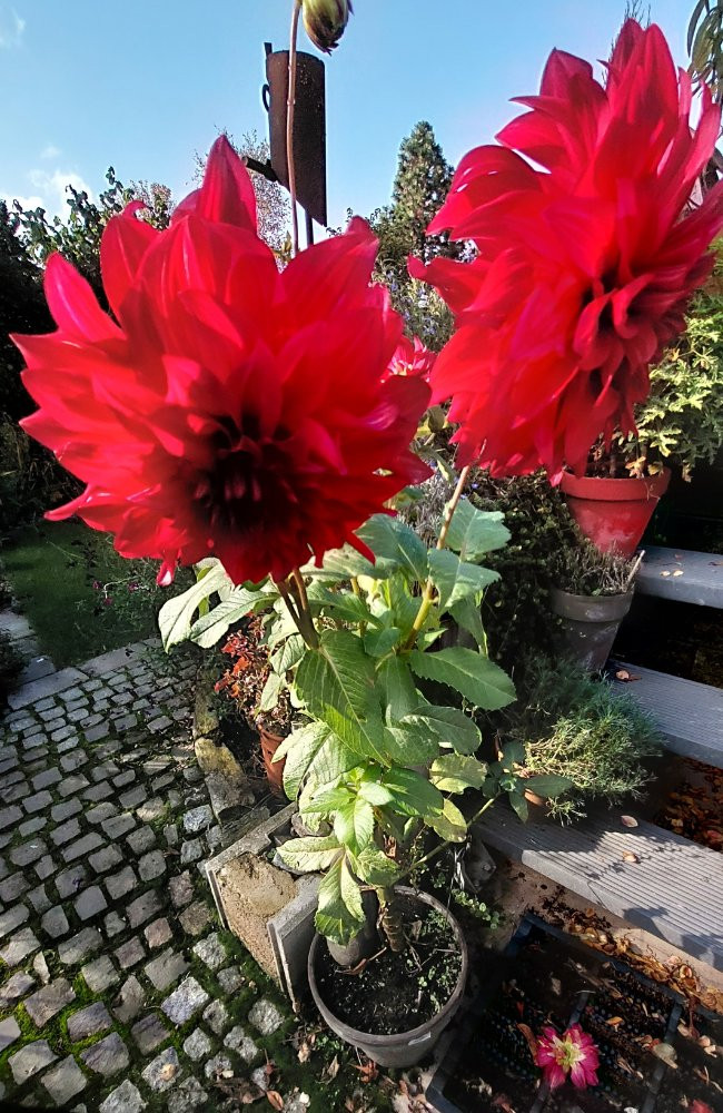 Dahlien. Bohemian Spartacus mit Monsterblüten.