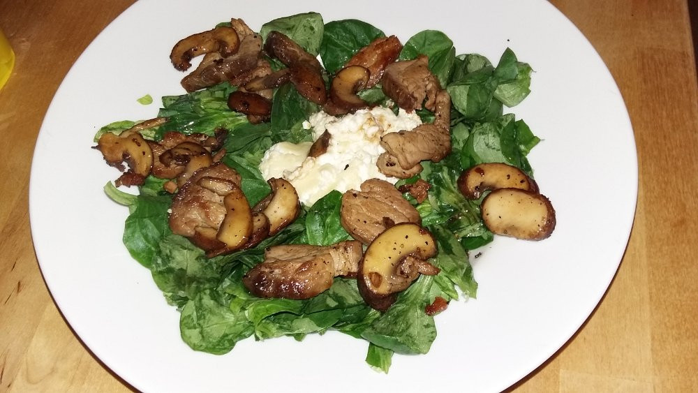 Hier gab es einen großen Teller mit Salat: Nüsschen, Schweinefilet, Champignons und mit Honig überbackenen Ziegenkäse, dazu Baguette