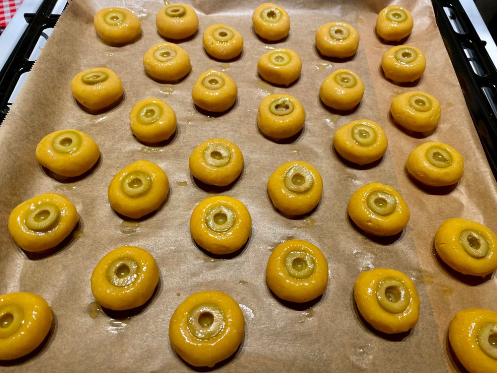 zum Aperitif (ein Kir - Weißwein mit einem Schluck Walnußlikör) geräucherten Rinderschinken und Blätterteigplätzchen (Blätterteig gekauft) mit Zwiebelconfit (Portwein, brauner Zucker, Balsamico, Salz und Pfeffer, Thymian, Rosmarin, Piment, Vanille),