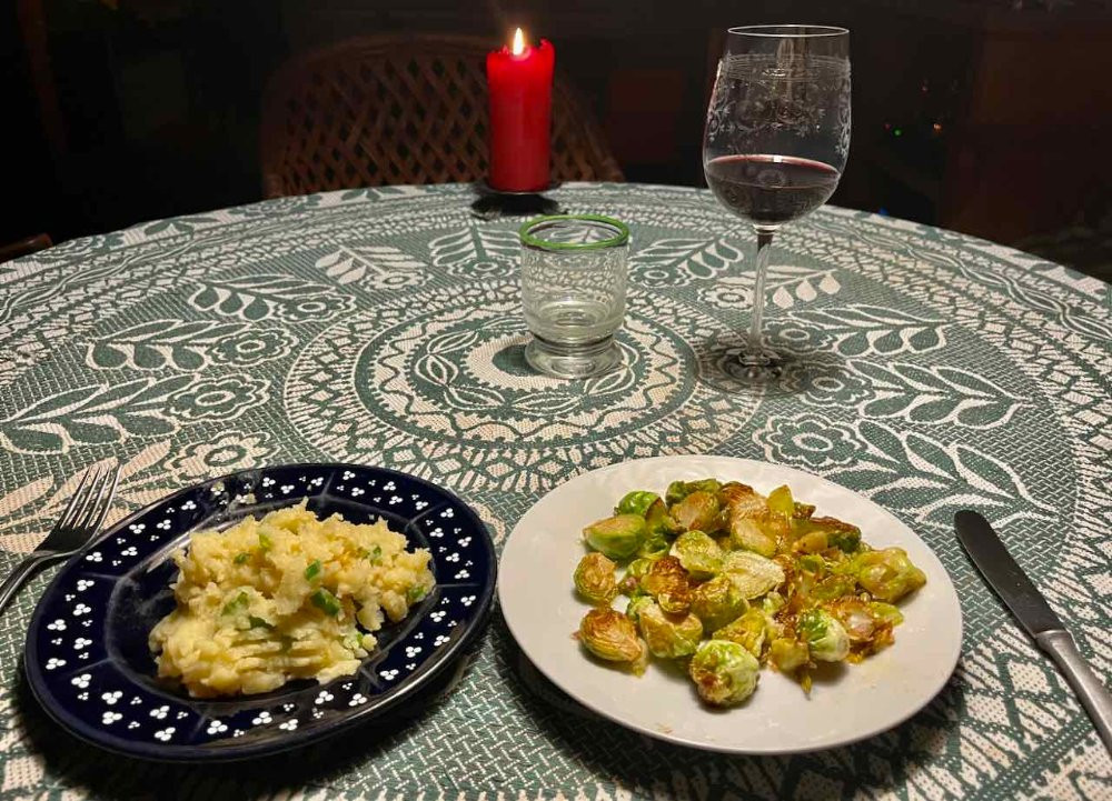 Rosenkohl, mit Butter und Schalotten gebraten und mit Rosmarin gewürzt sowie Kartoffelbrei mit Frühlingszwiebeln