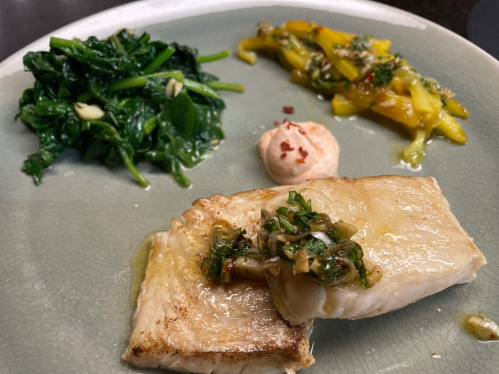 Bei uns gab es Kabeljau, Spinat und Spitzpaprika.