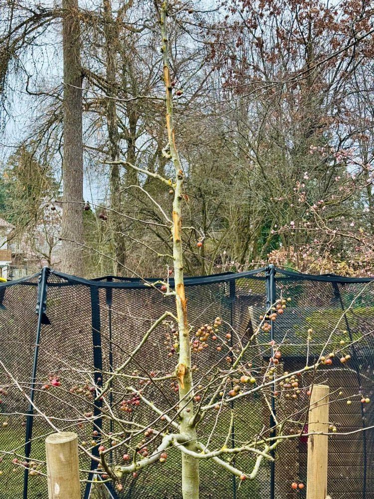 Dieser Malus 'Evereste' wurde erst in diesem Frühjahr neu gepflanzt, nachdem ein Herbststurm den alten wunderschönen Zierapfel mit großer Krone umgeworfen hatte.