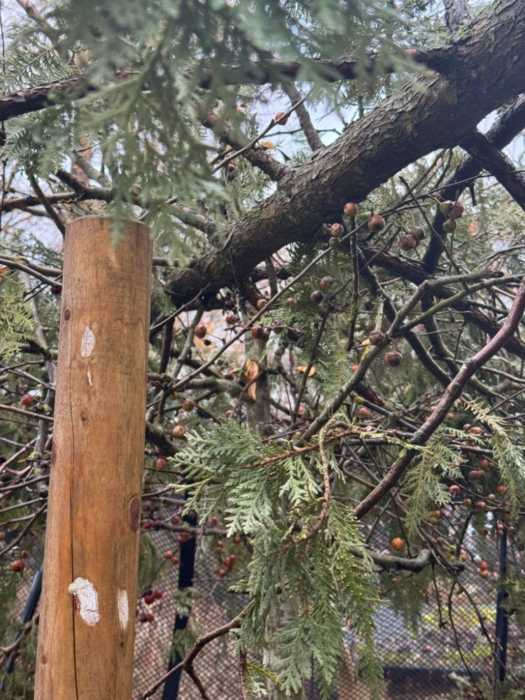 Eine Fichte beim Nachbarn ist umgefallen, und hat das neue ( ziemlich teure) Bäumchen halb weg rasiert.