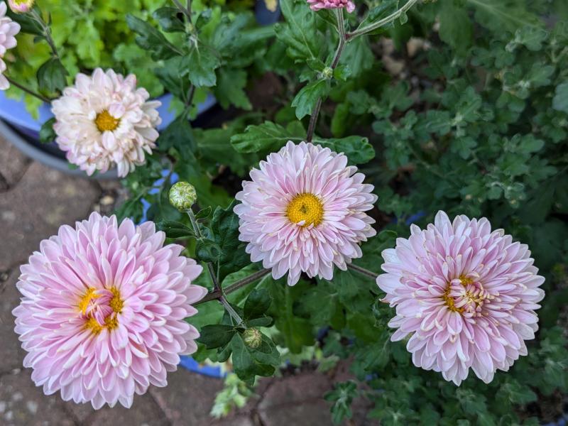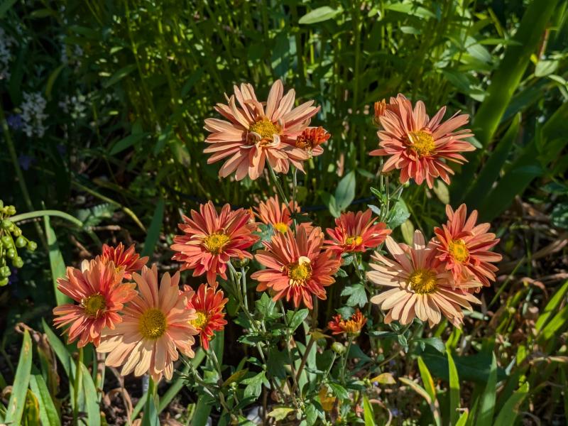 Meine Chrysanthmen wollen noch nicht blühen, die müssen erstmal den Chelsea Chop und dann das Umpflanzen aus dem Kübel ins Beet verkraften. Ich bin nur mal gespannt, welche Sorten überlebt haben, da die Schilder vor dem Umpflanzen verschwunden waren.