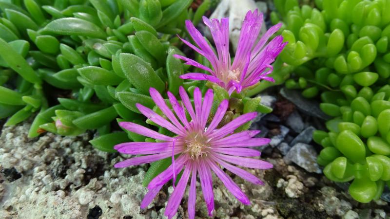 Ministeingarten, über Winter besser hier unter Dach, Jovibarba mit Lychnis (? nenne ich immer sibirica ) Selbsteinsaat, blüht seit vielen Wochen.